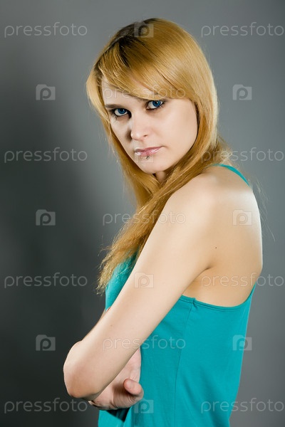 Молодая голубоглазая блондинка на сером фоне