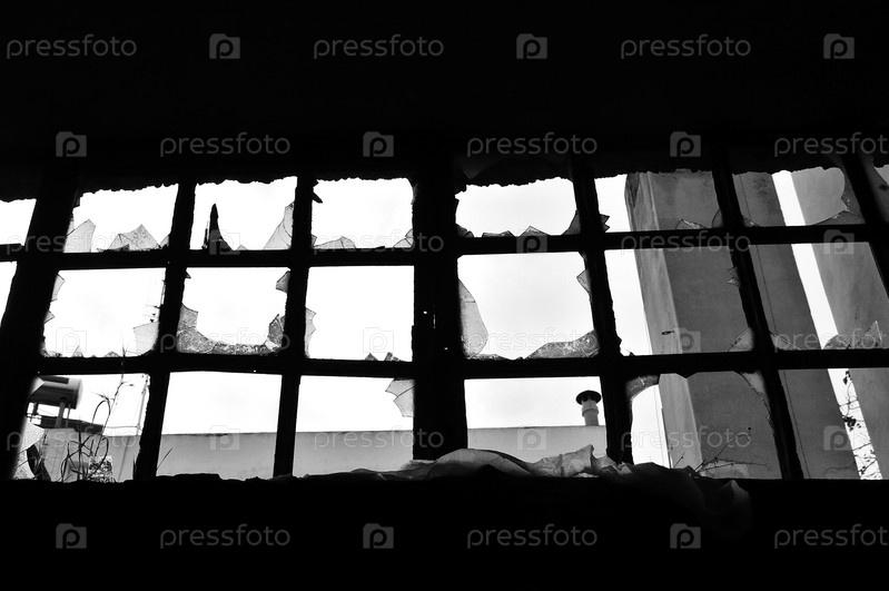Разбитое окно на заброшенном заводе. Черно-белое изображение