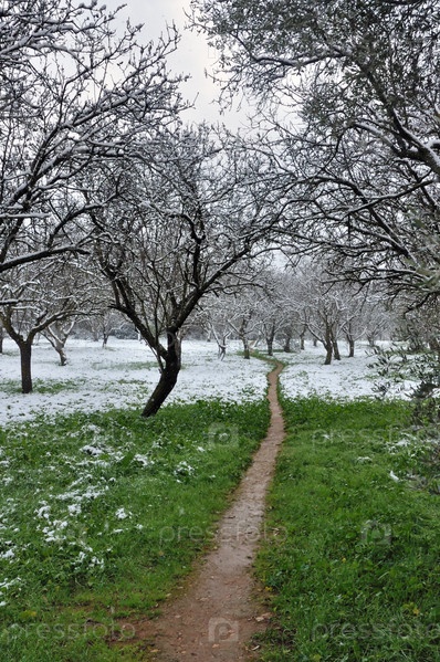 Тропинка в саду миндальных деревьев. Снежный зимний пейзаж