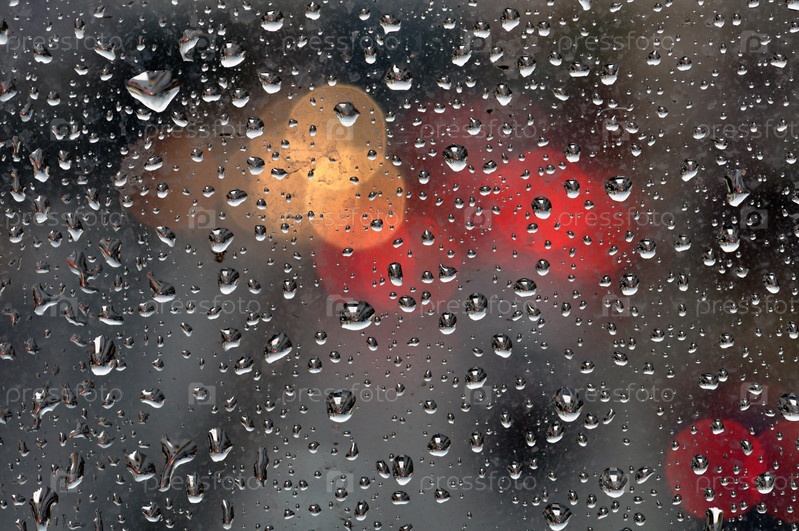 Капли дождя на поверхности стекла и размытые абстрактные огни города