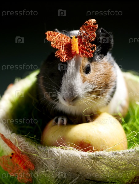 Морская свинка с яблоком на черном фоне