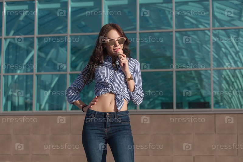 Молодая, красивая брюнетка ест розовое мороженое