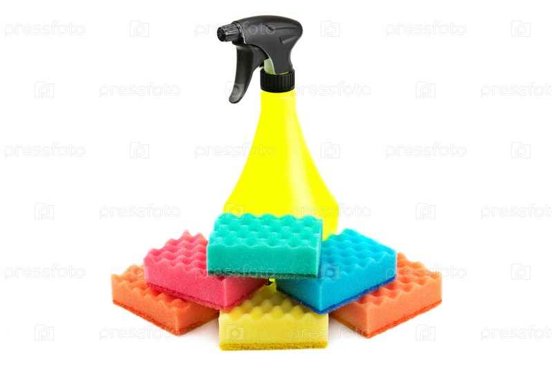 Разноцветные губки и опрыскиватель, изолированные на белом фоне