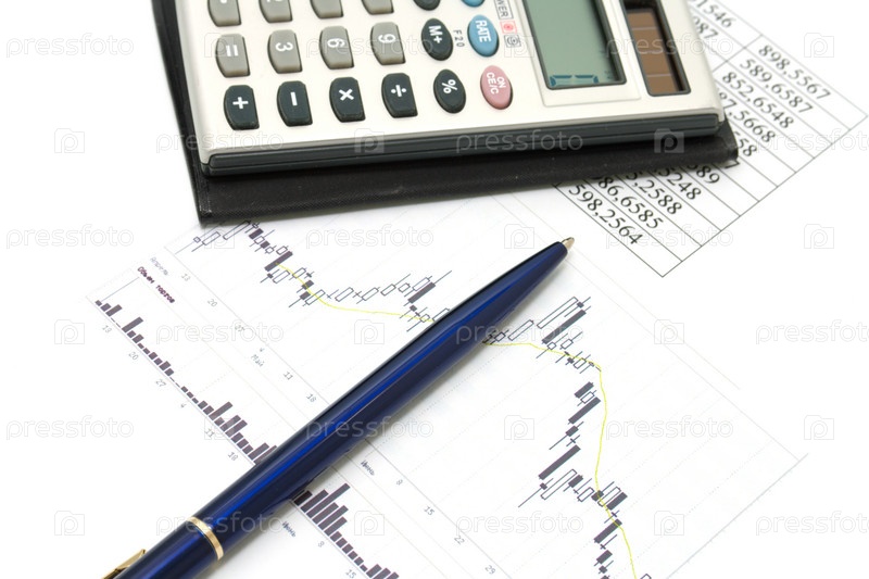Калькулятор, графики и ручка на белом фоне