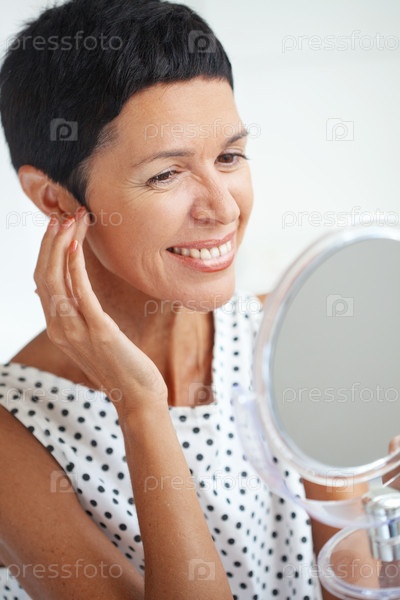 Красивая взрослая женщина, держащая косметическое зеркало