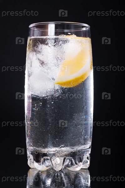 Минеральная вода со льдом и лимоном в стакане на черном фоне