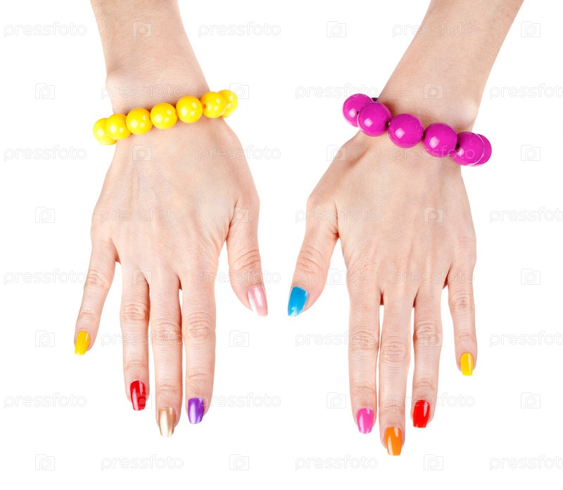 Женские руки с модным маникюром и браслетами