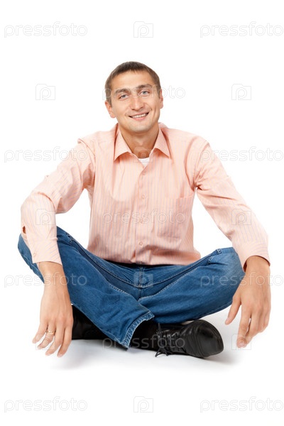 Улыбающийся человек, сидящий в позе лотоса на белом фоне