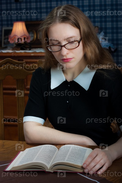Красивая молодая женщина в очках читал книгу за столом