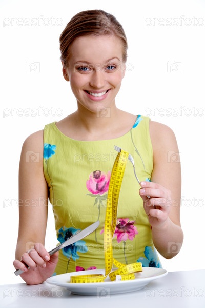 Привлекательная улыбающаяся девушка держит на вилке сантиметр