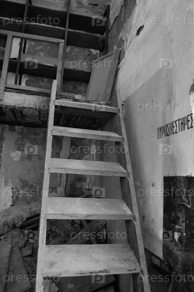 Деревянная рушащаяся лестница на чердак и знак огнетушителя на заброшенном заводе. Черно-белое изображение