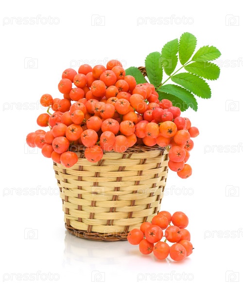 Плетеная корзина с ягодами рябины на белом фоне крупным планом