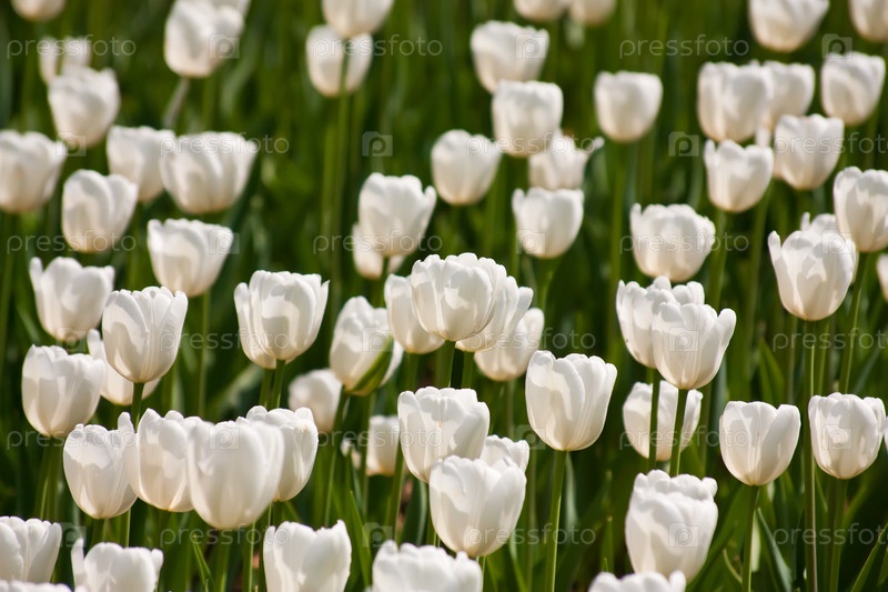 Красивые белые тюльпаны весной на фоне зеленых листьев