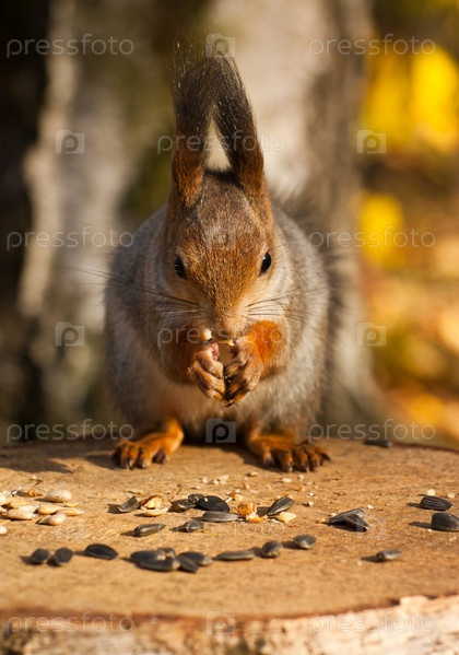 Рыжая евразийская белка на пне