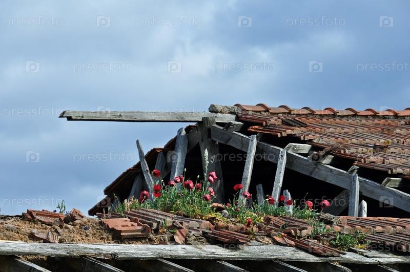 Красные цветы, растущие на разрушенной крыше заброшенного дома