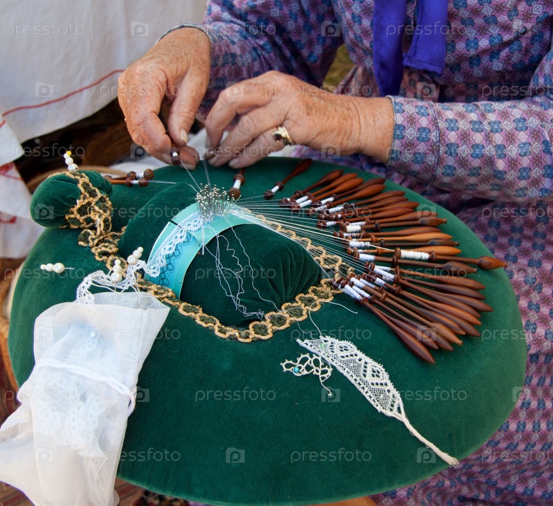 Подушки с бобинами, булавки и руки, плетущие кружева
