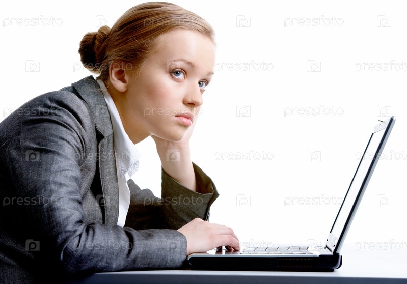 Задумчивая деловая молодая женщина работает за ноутбуком