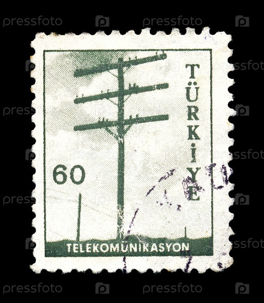 Старинная почтовая марка с телефонным столбом. Турция, 1960 год