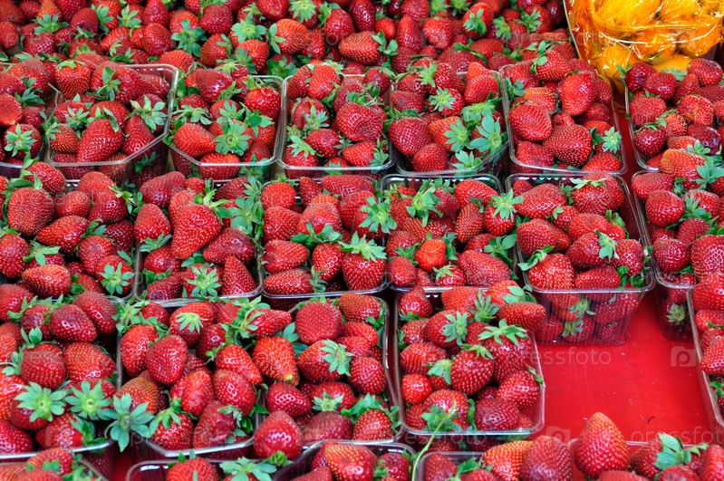 Спелая клубника в пластиковых ящиках в продуктовом магазине