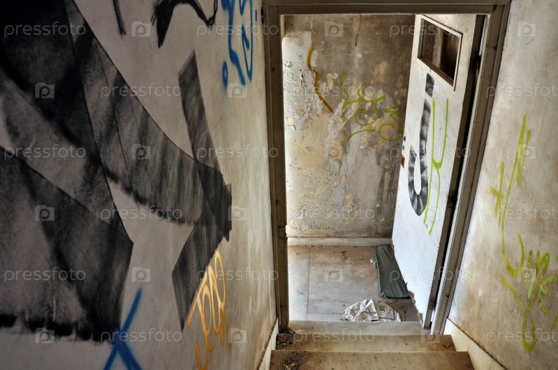 Стрелки на лестнице, указывающие на выход в заброшенном доме