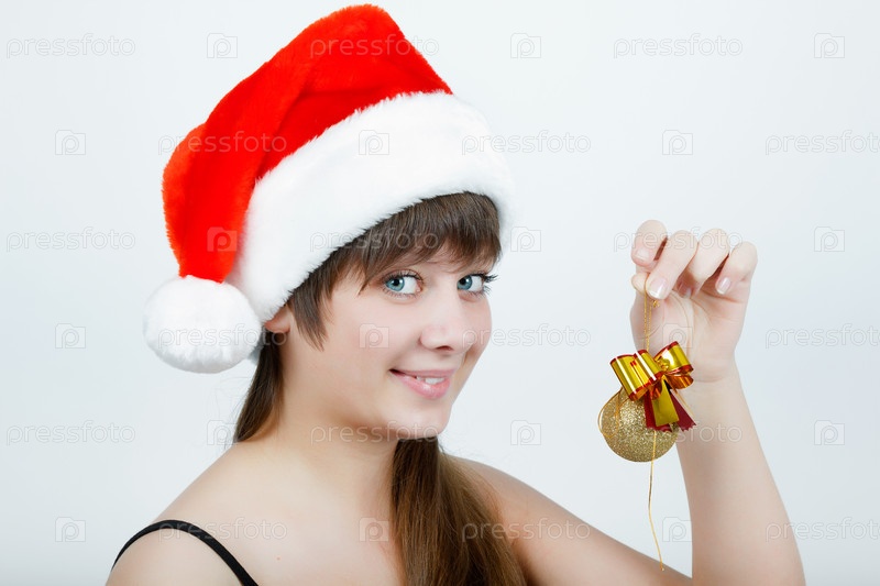 Привлекательная девушка в новогоднем колпаке с елочным украшением