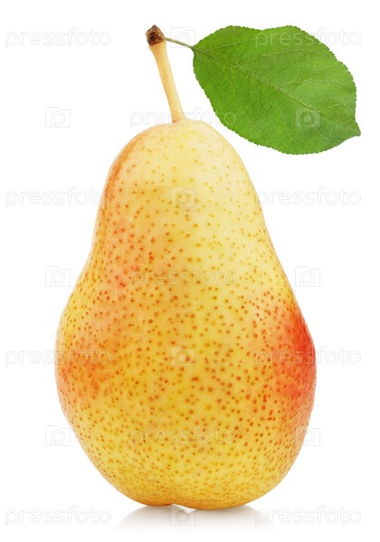 Спелая желто-красная груша с листьями, изолированная на белом