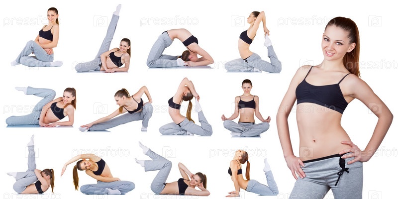 Коллаж из различных фитнес-упражнений на белом фоне