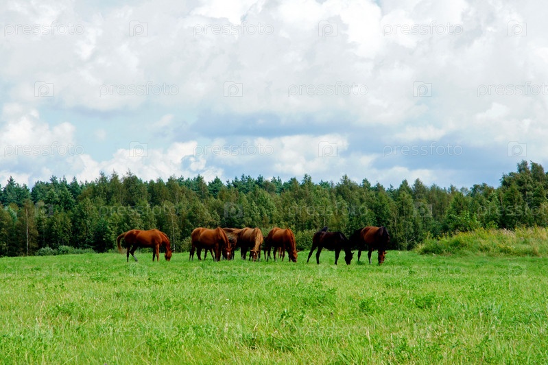 Несколько лошадей пасутся на лугу летним днем