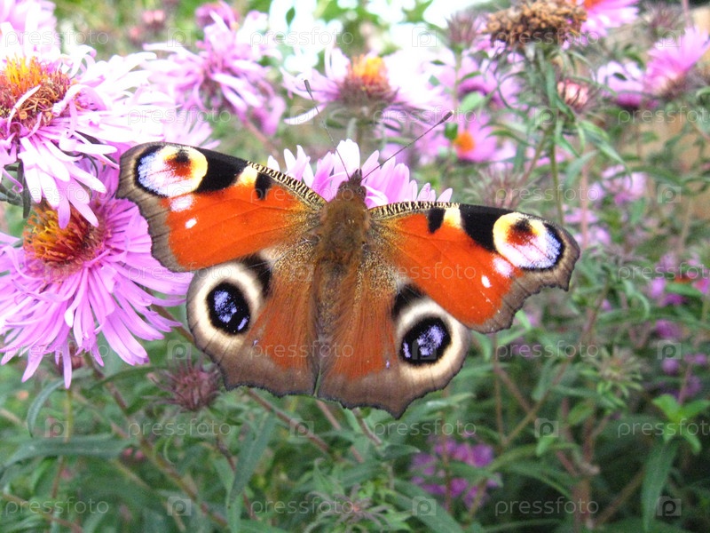 Бабочка Павлиний глаз сидит на астре