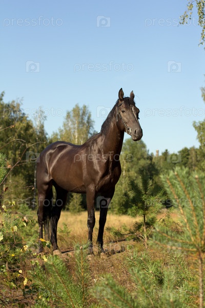 Стойка вороного жеребца на фоне голубого неба на опушке леса