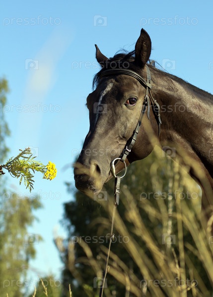 Вороной жеребец нюхает желтый цветок пижмы на фоне голубого неба