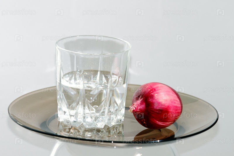 Стакан водки и закуска на темной тарелке на белом фоне