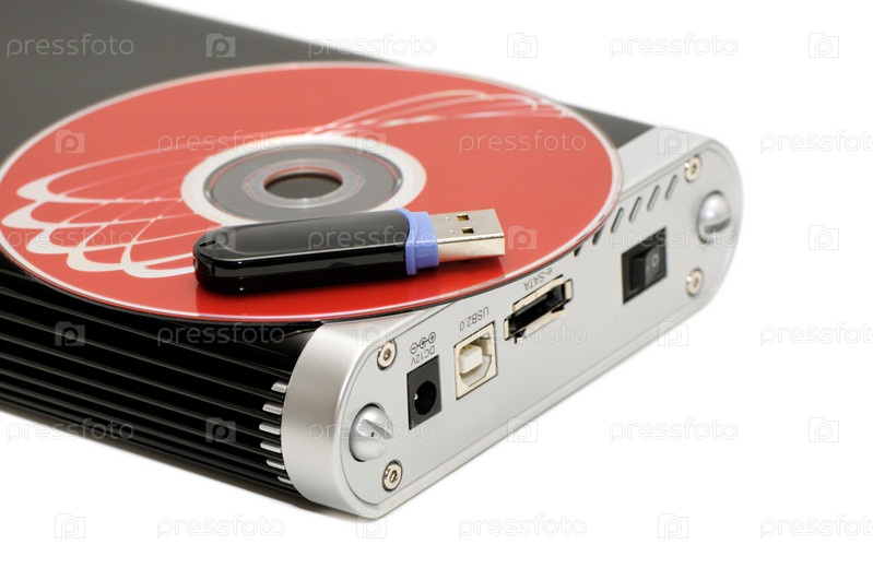 Жесткий диск, флэш-карта и диск, изолированные на белом фоне