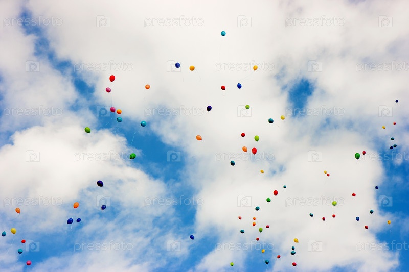 Разноцветные шары в голубом небе с белыми облаками