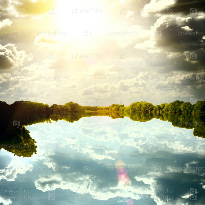 Спокойный красивый пейзаж с озером и небом, отражение в воде