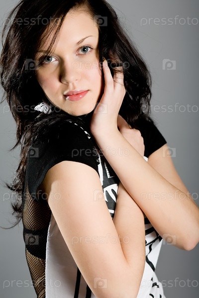 Портрет темноволосой девушки на сером фоне