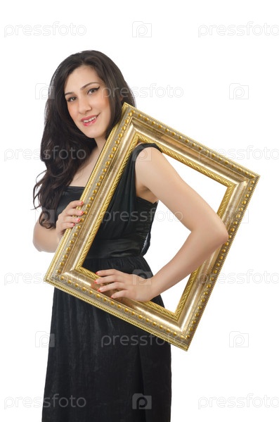 Женщина с фоторамкой на белом фоне