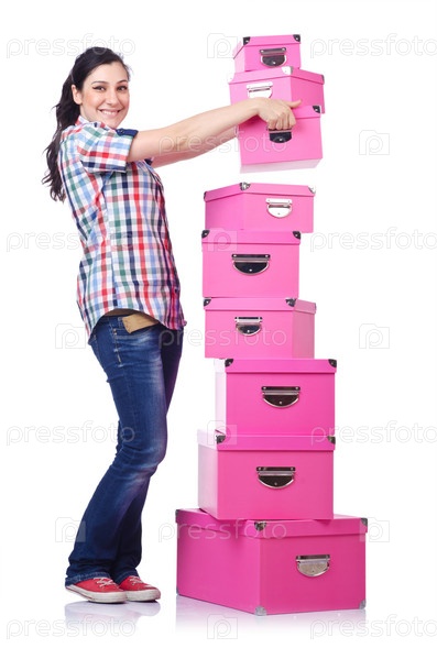 Девушка со стопкой подарков на белом фоне