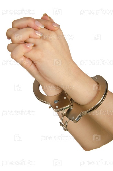 Руки в наручниках на белом фоне