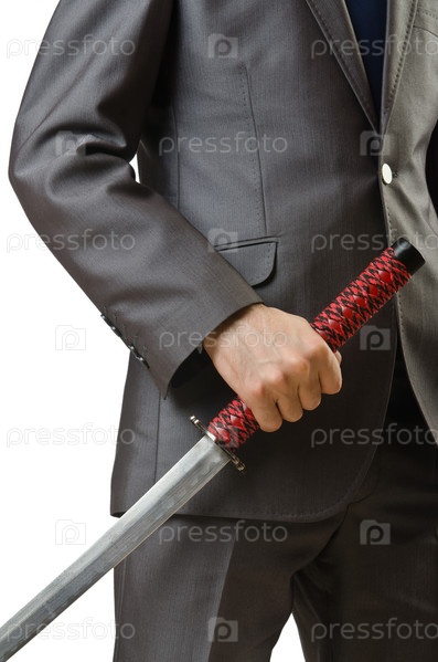 Бизнесмен с мечом на белом фоне