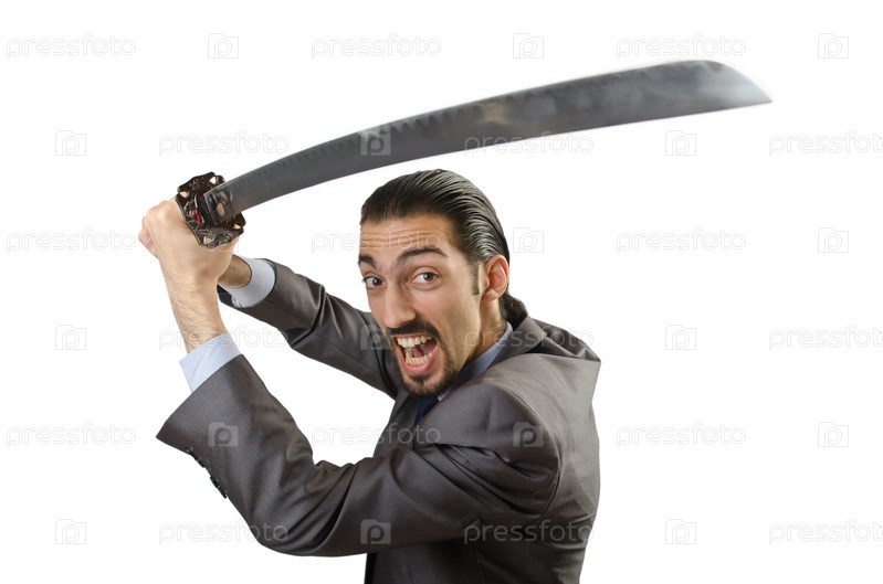 Бизнесмен с мечом на белом фоне