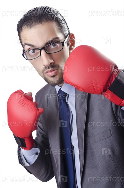Бизнесмен в боксерских перчатках на белом фоне