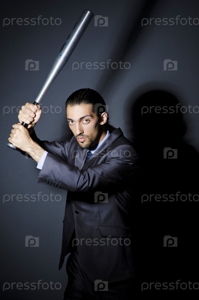 Злой бизнесмен с битой на белом фоне