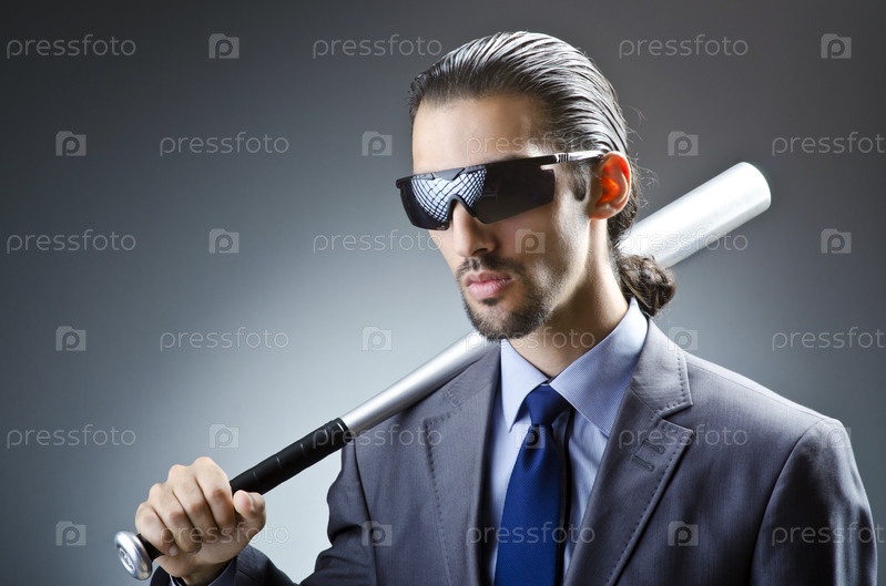 Злой бизнесмен с битой на белом фоне
