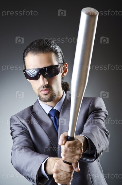 Злой бизнесмен с битой на белом фоне