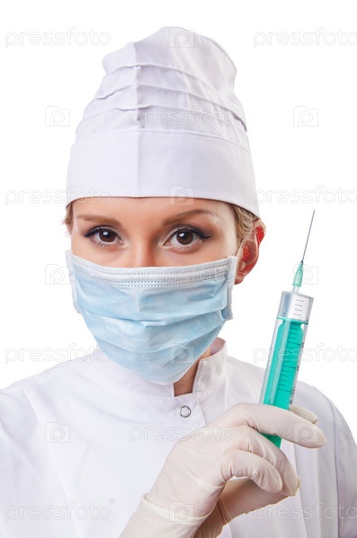 Женщина-врач со шприцем на белом фоне