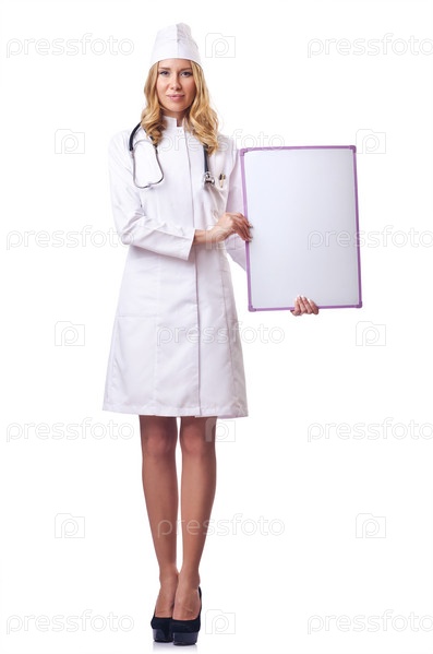 Привлекательная женщина-врач с чистой доской, изолированная на белом фоне