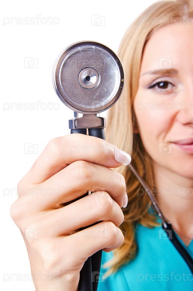 Привлекательная женщина-врач, изолированная на белом фоне