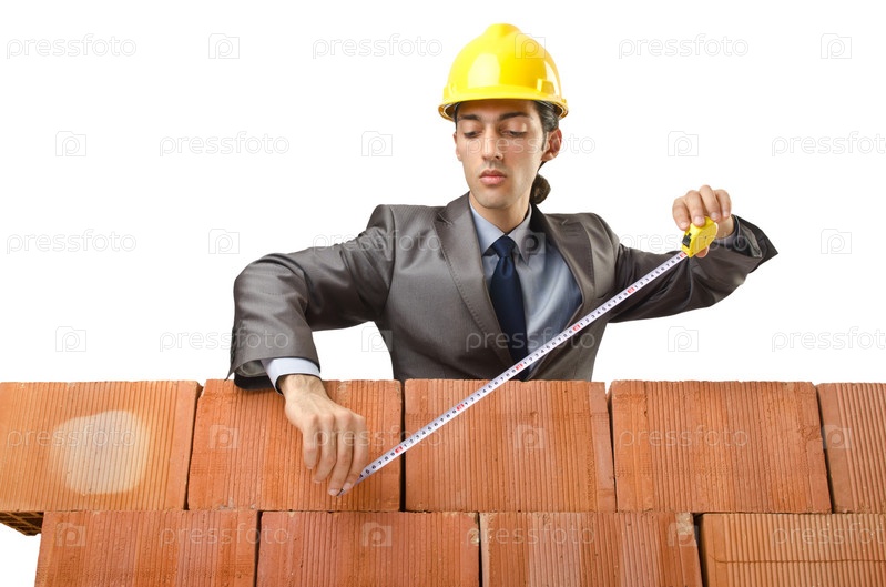 Бизнесмен с кирпичами на белом фоне