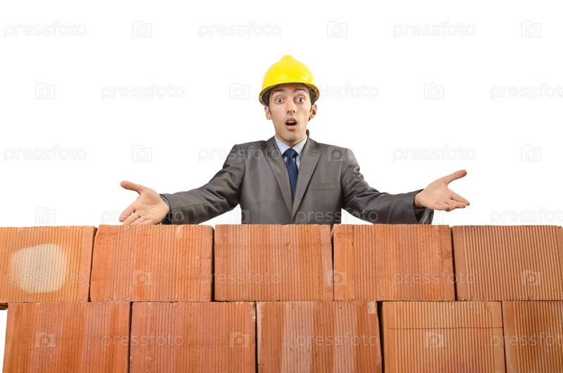 Бизнесмен с кирпичами на белом фоне